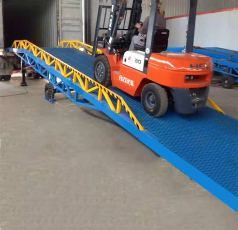 移動式液壓登車橋是與叉車配合使用的貨物裝卸輔助設備,可根據汽車車廂的高低調節高度,叉車可以直接通過本設備駛入車廂內部進行貨物的批量裝卸,僅需單人作業,即可實現貨物的快速裝卸。它使企業減少大量勞力,提高工作效率,獲取好的經濟效益。